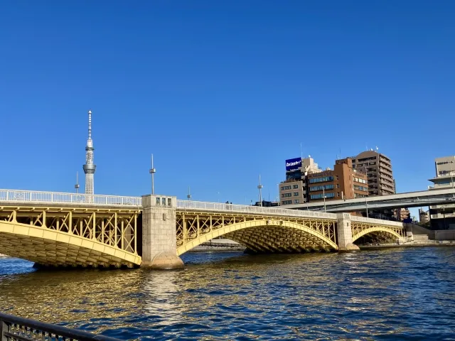 隅田川にかかる橋で、蔵前らしい水辺の景色を楽しめるスポット。橋の上からは川沿いの街並みや東京スカイツリー方面の眺めも広がり、散歩途中の立ち寄りにおすすめです。